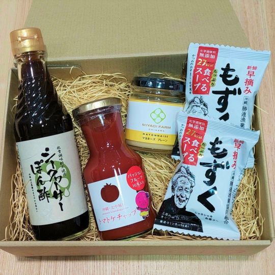 内容量 【沖縄特産販売シークヮーサーぽん酢】250ml、【みやぎ農園マヨネーズ プレーン】80g、【きたなか荘弁当パッションフルーツ果汁入り トマトケチャップ】200g、【勝連漁業協同組合新鮮早摘みもずくスープ】8.8g×2